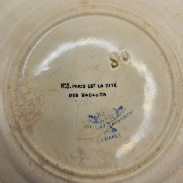 Descriptif rapide : Magnifique assiette parlante française en faïence fine, de la célèbre manufacture Creil et Montereau. Fait partie de la série humoristique et recherchée "Paris est la Cité des Badauds" (période B & Cie, 1876-1884).