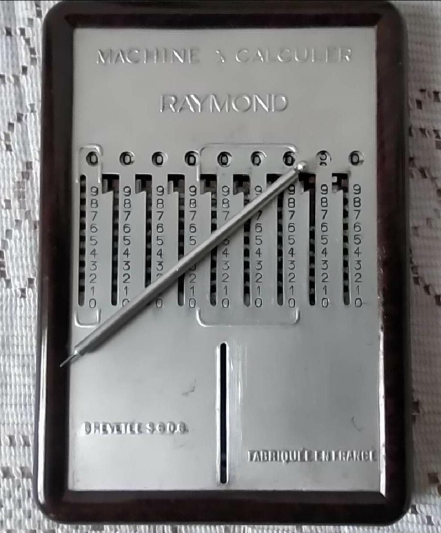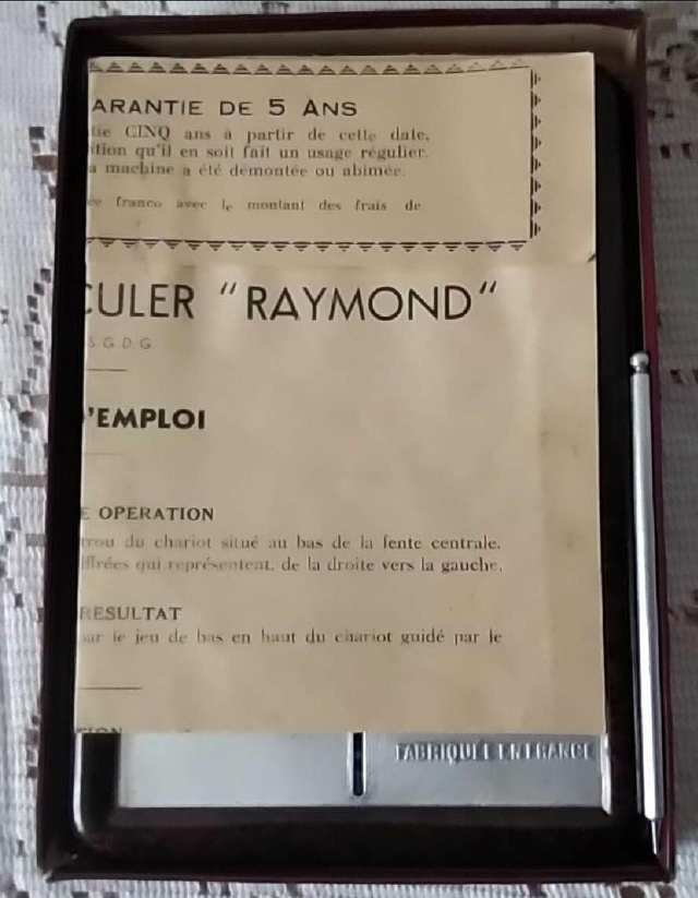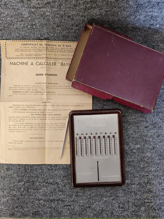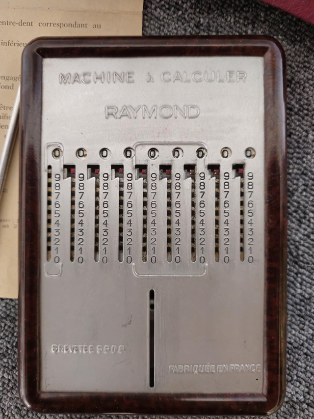 ​L'ensemble est particulièrement complet, comprenant ​●La Machine à Calculer Raymond (boîtier en bakélite marron et plaque frontale en métal).