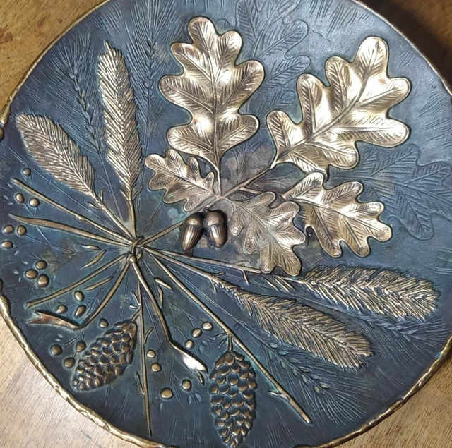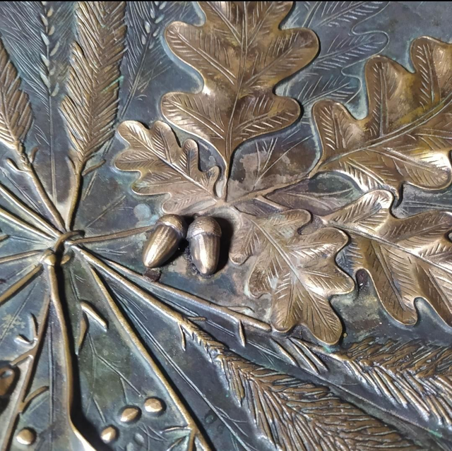 ​Décor Naturaliste d'une grande finesse : feuilles de chêne, glands, pommes de pin et épis de blé, symbolisant la nature et l'abondance.