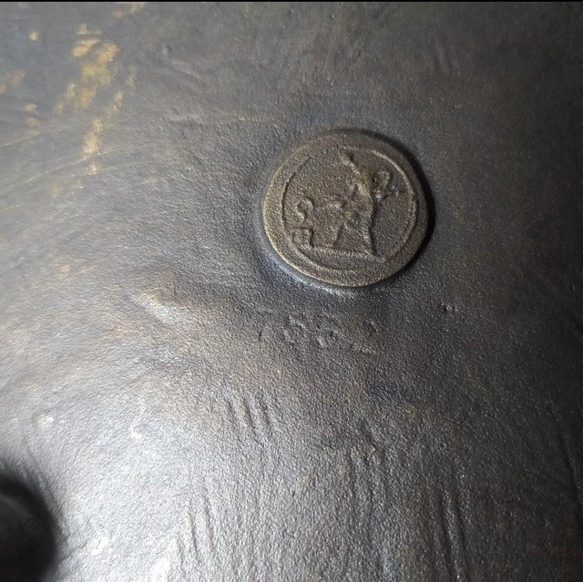 ​Cachet de Fondeur d'Art : Présence d'une marque circulaire figurant un artisan coulant la fonte dans un moule.