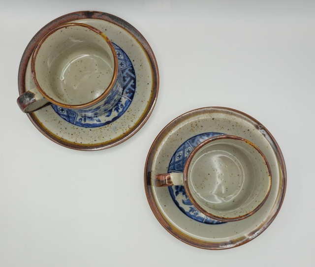 Superbe ensemble de deux tasses et leurs sous-tasses en grès moucheté, typique de l'artisanat japonais (Minoyaki).