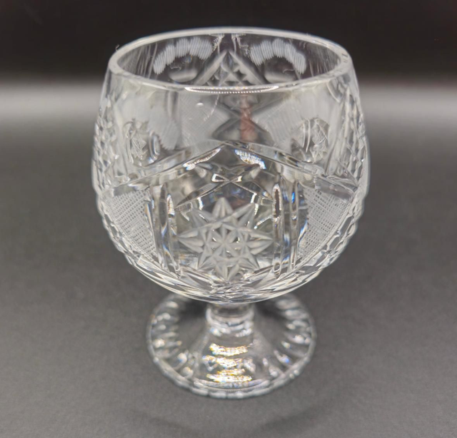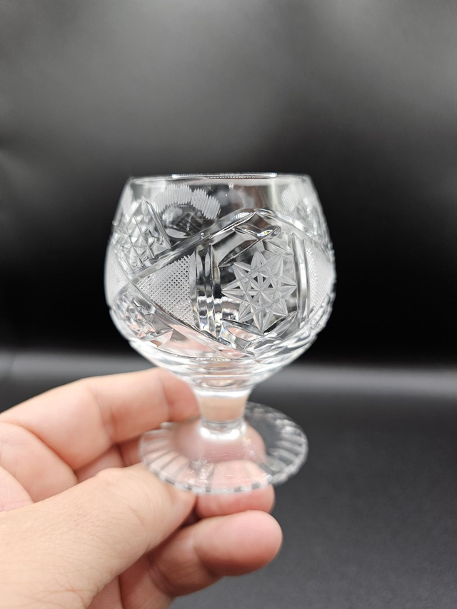 Chaque verre présente une taille profonde et brillante avec un décor géométrique raffiné, incluant une étoile centrale et des motifs en pointe de diamant.