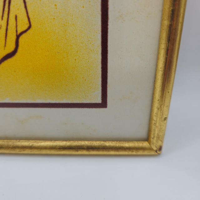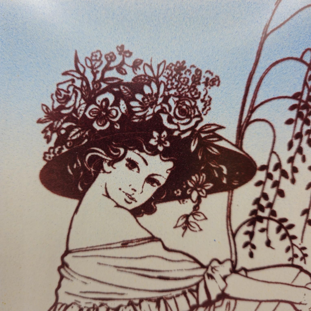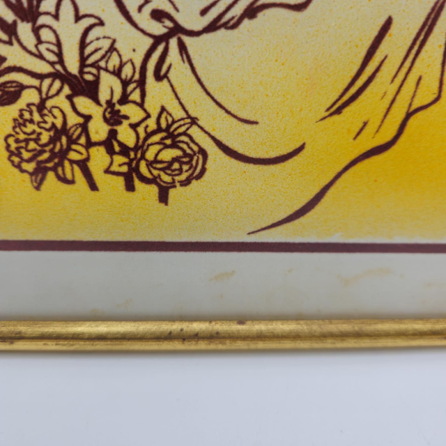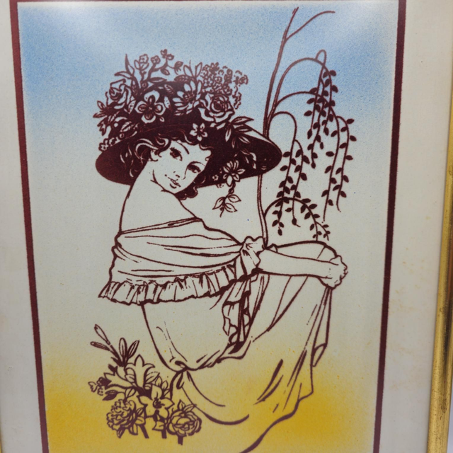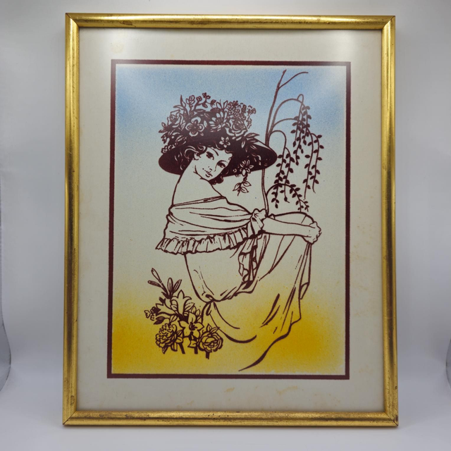 ●illustration encadrée sous verre, mettant en vedette une dame élégante au grand chapeau fleuri. Couleurs vives et lignes graphiques rappellent le charme de l'Art Nouveau (Mucha) et l'esthétique pop des années 1970