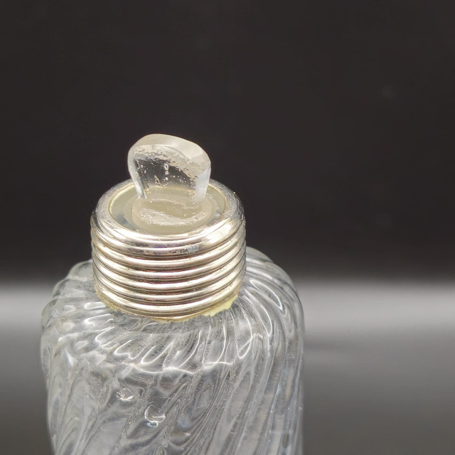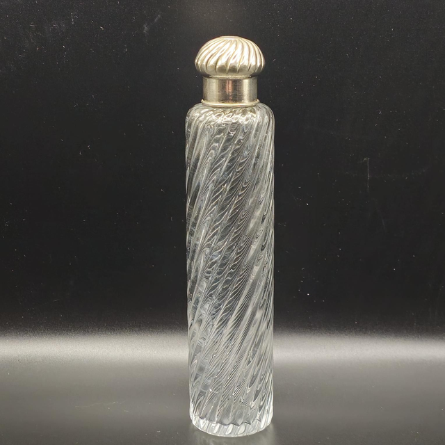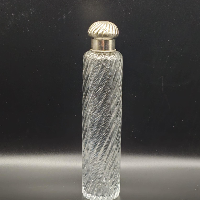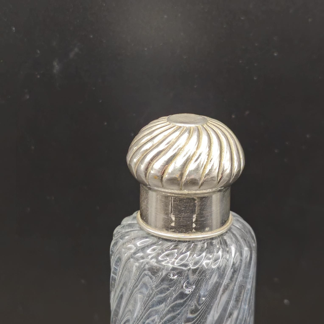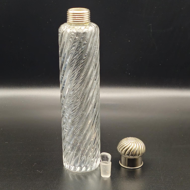 ●Élégant flacon de voyage ou de toilette d'époque fin XIXe début XXe. Le corps en cristal présente une magnifique décoration en côtes torsadées. Il est doté d'une double fermeture : un bouchon intérieur en verre à l'émeri pour l'étanchéité et un capuchon extérieur bombé en métal argenté au motif assorti. Un objet de collection raffiné et un témoignage de l'art de la toilette de luxe.