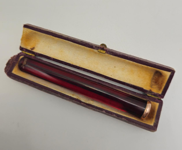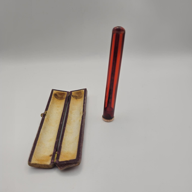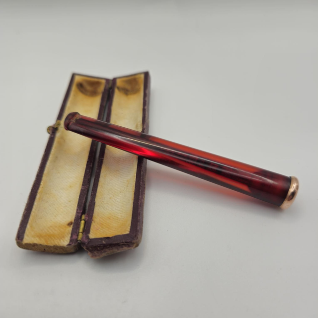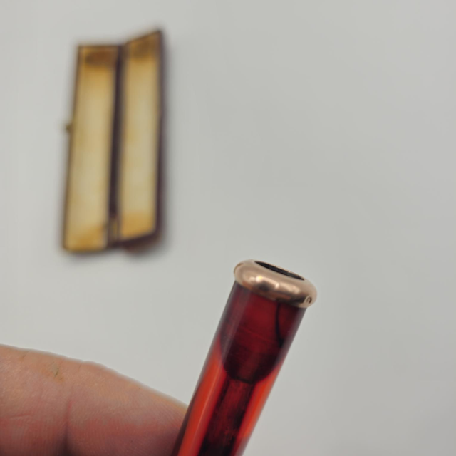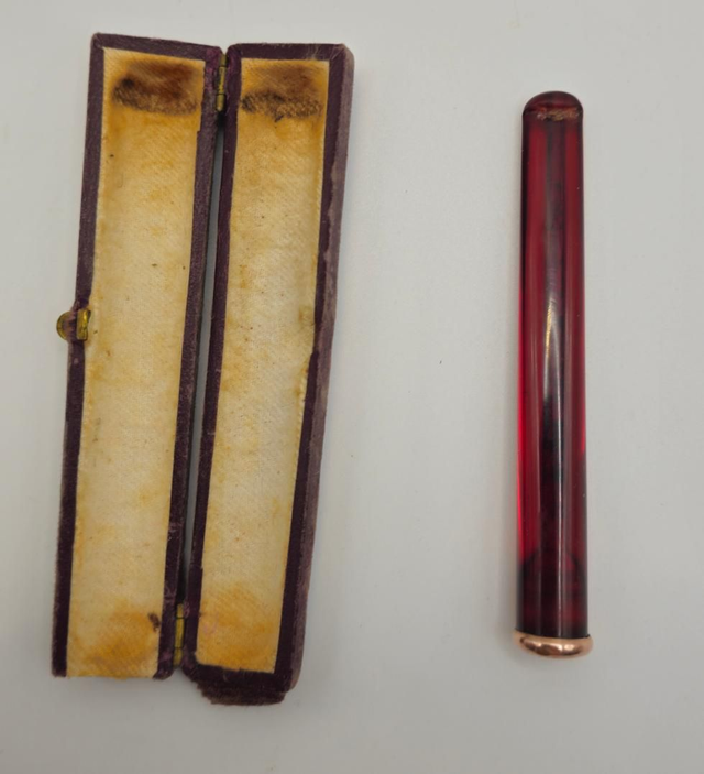 ● Superbe et rare fume-cigarette de collection années 20-30, véritable témoin de l'élégance de l'entre-deux-guerres. Corps de couleur rubis profond (Bakélite), monté d'un luxueux embout en métal, probablement Argent Doré.