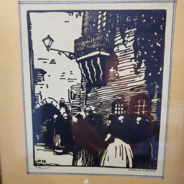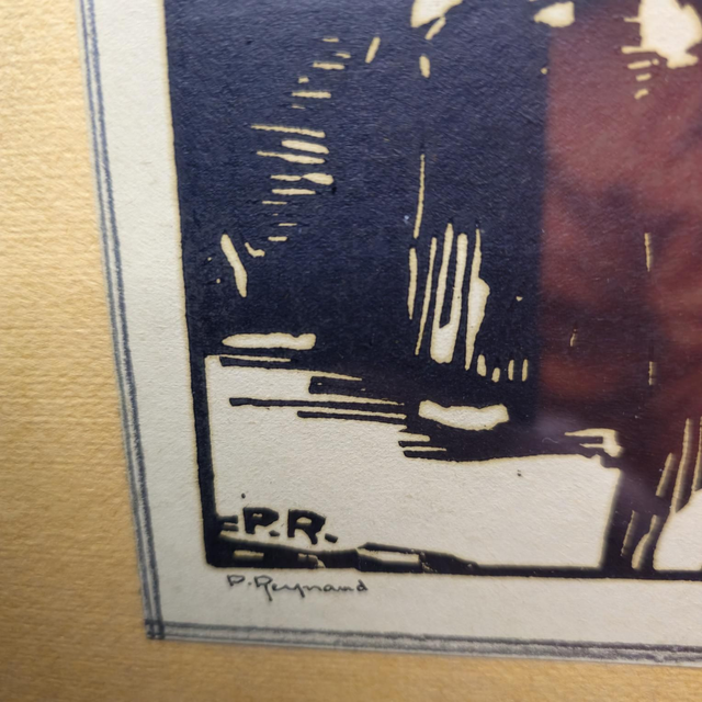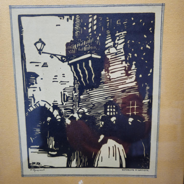 ​Magnifique Xylogravure originale, représentant une scène de rue animée, signée par l'artiste régionaliste Pierre REYNAUD (1881-1943).