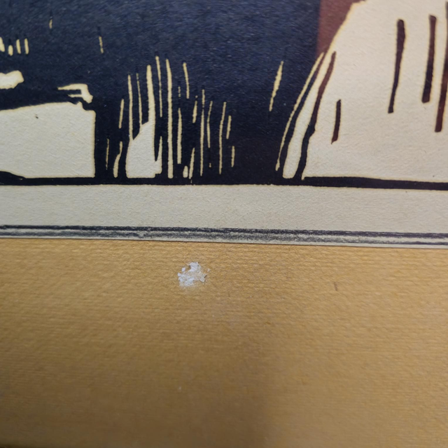 ​L'œuvre est en bon état général, mais le passe-partout présente une tache blanche bien visible sur les photos. La gravure elle-même est protégée par le verre.