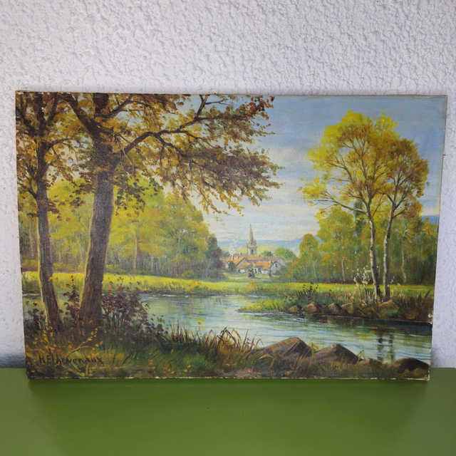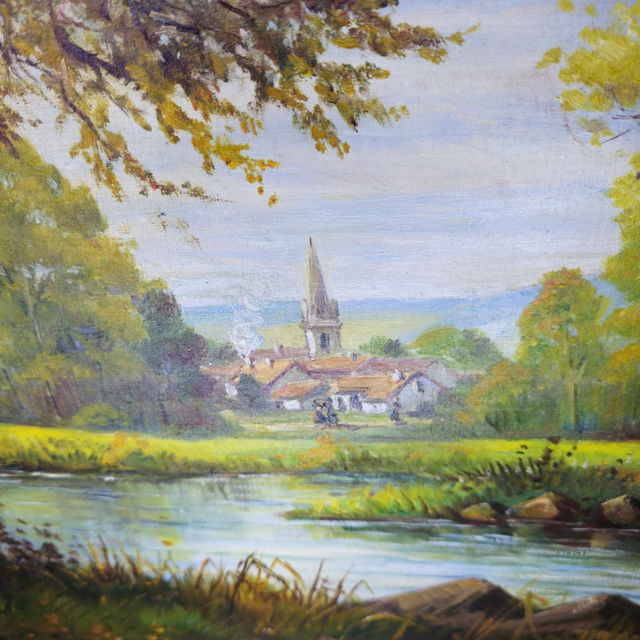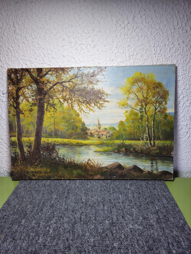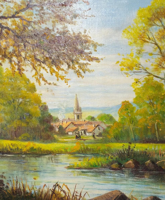 Superbe scène bucolique d'automne par le peintre paysagiste Henri Ethevenaux (1870-1947). Cette huile sur toile dépeint avec des touches vibrantes un paysage forestier et fluvial menant à un village pittoresque dominé par son clocher. Une œuvre lumineuse et apaisante, idéale pour les amateurs de paysages classiques français.