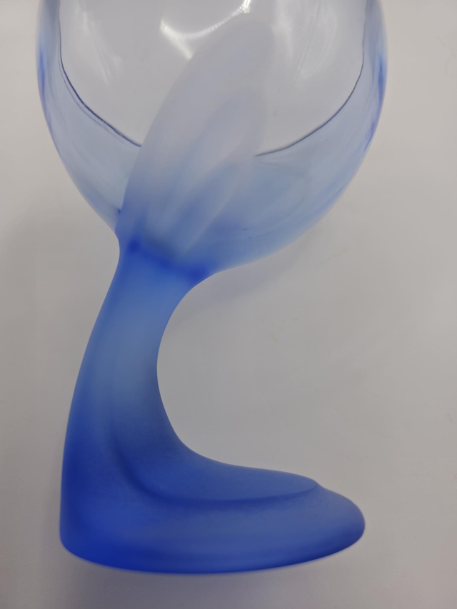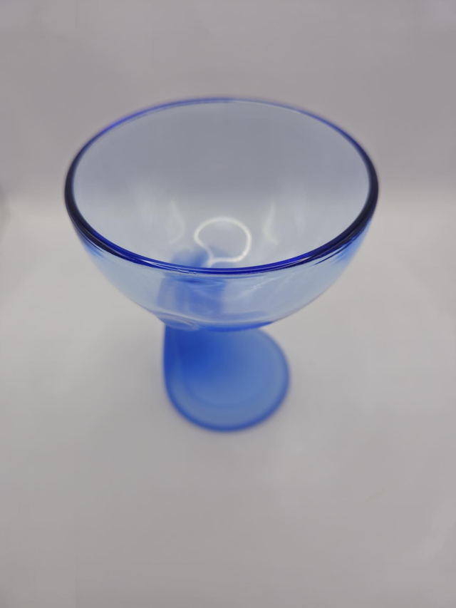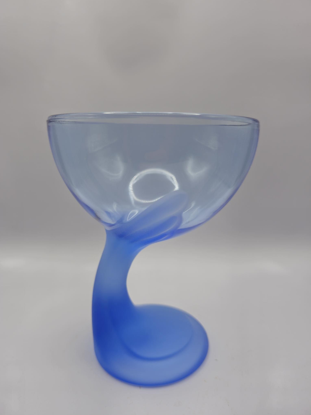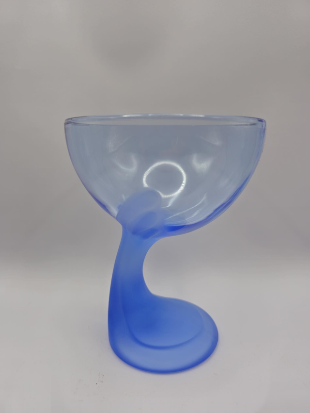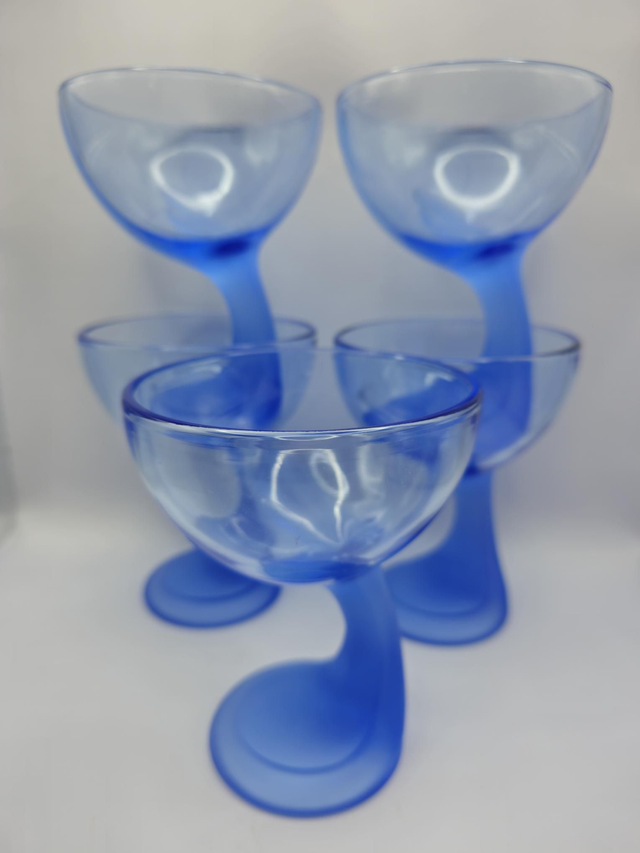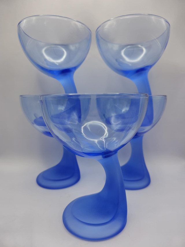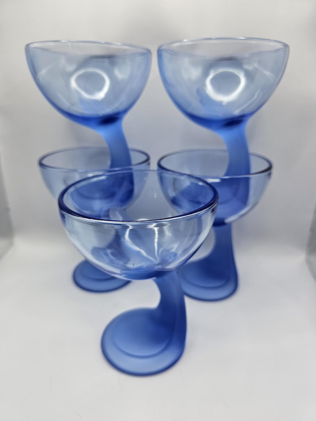 Lot de 5 magnifiques coupes à glace, coupes à fruits, à desserts, couleur bleue cobalt, signées Rocco Bormioli sous le pied. Modèle avec le pied en forme d'aile en verre sablé.