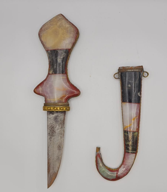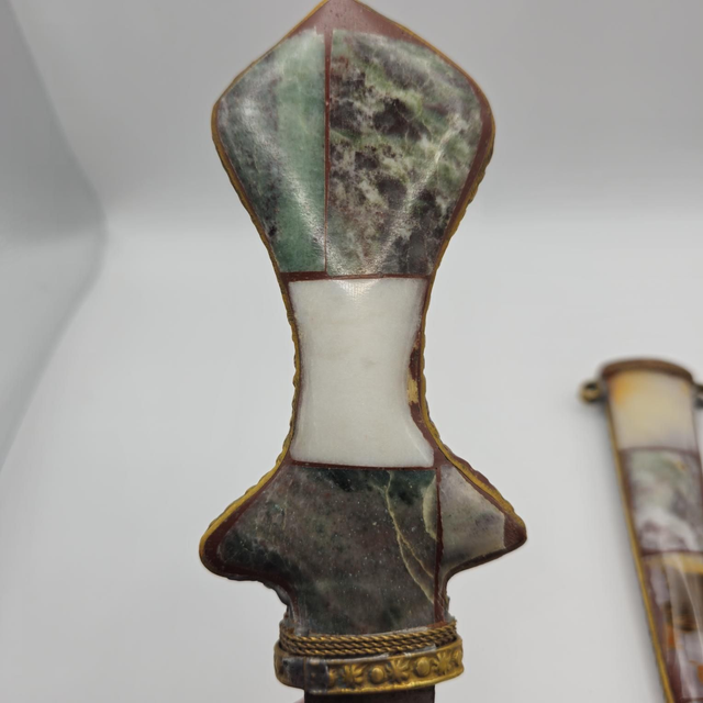 Poignard de collection, orné de riches incrustations en mosaïque de pierres (agate, jaspe, onyx) et de fines montures en laiton.