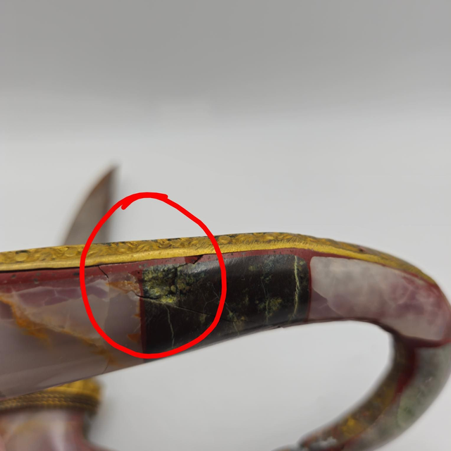 Éclat visible sur une pierre du poignard (voir photo cerclée de rouge).
