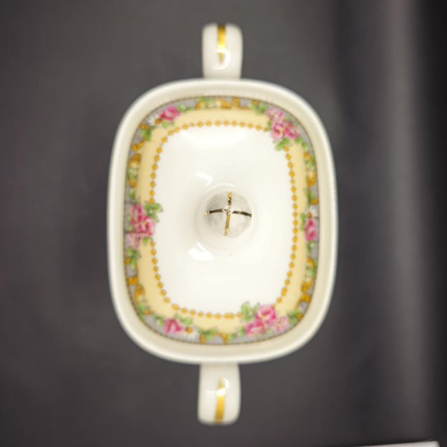 ●Forme élégante (carrée/rectangulaire) avec décor raffiné : Frise de Roses romantiques sur fond crème/jaune pâle, rehaussé de motifs Art Déco et de riches dorures à l'or fin.