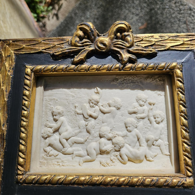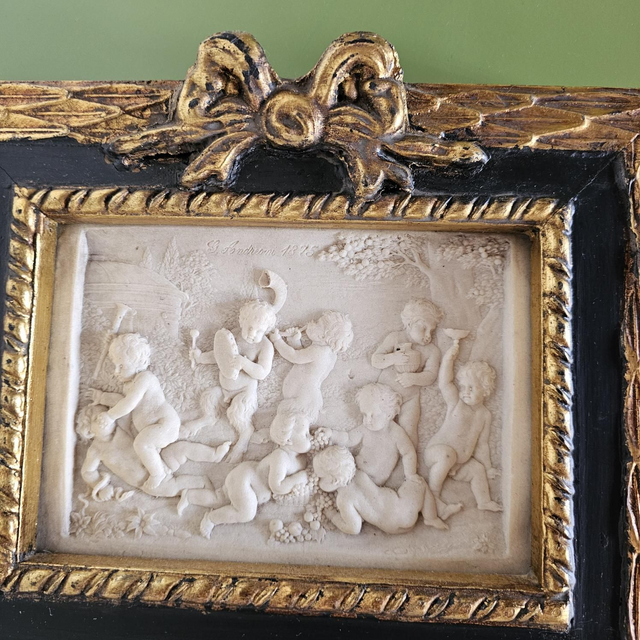 ●Partie Supérieure : Bas-relief représentant une Bacchanale de Putti (chérubins). L'œuvre est signée "G. Santarelli 1813" (reproduction d'une sculpture néoclassique de Gaetano Santarelli).