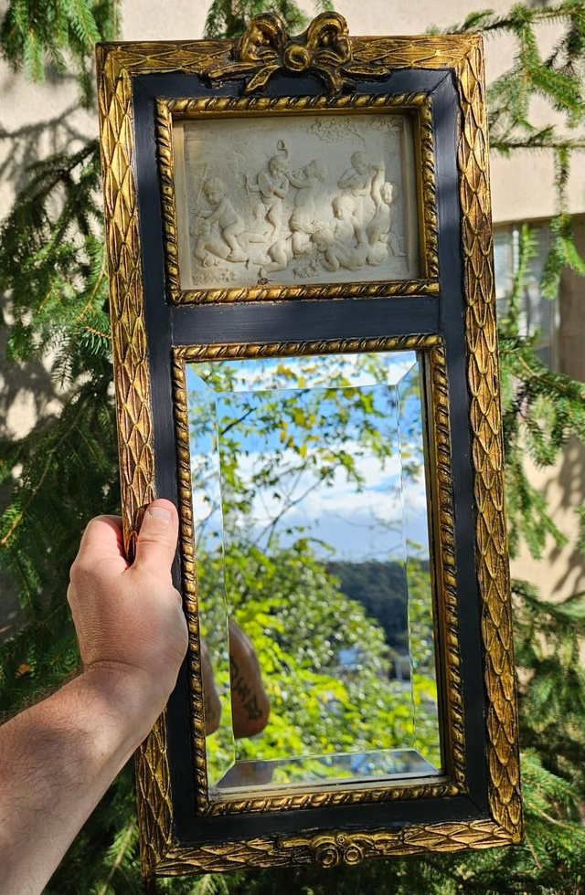 Superbe miroir rectangulaire, encadrement noir et or richement orné (ruban en haut, motifs tressés).