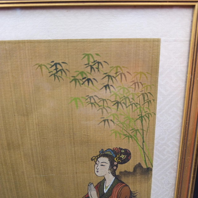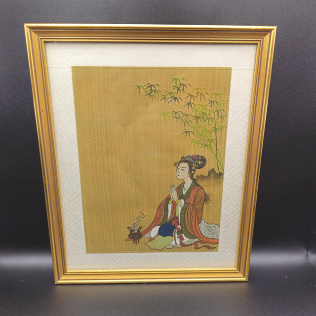 Élégante peinture sur soie encadrée, inspirée de l'art traditionnel chinois. Représentant une femme méditant sous des bambous, cette œuvre dégage calme et sérénité. Idéale pour apporter une touche d'exotisme et de raffinement. Encadrement réalisé par l'Atelier ART DÉCO Charles Degeorge (Céret)."