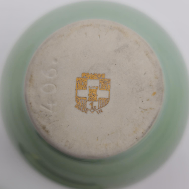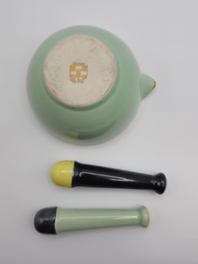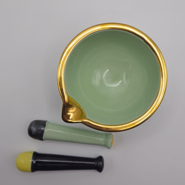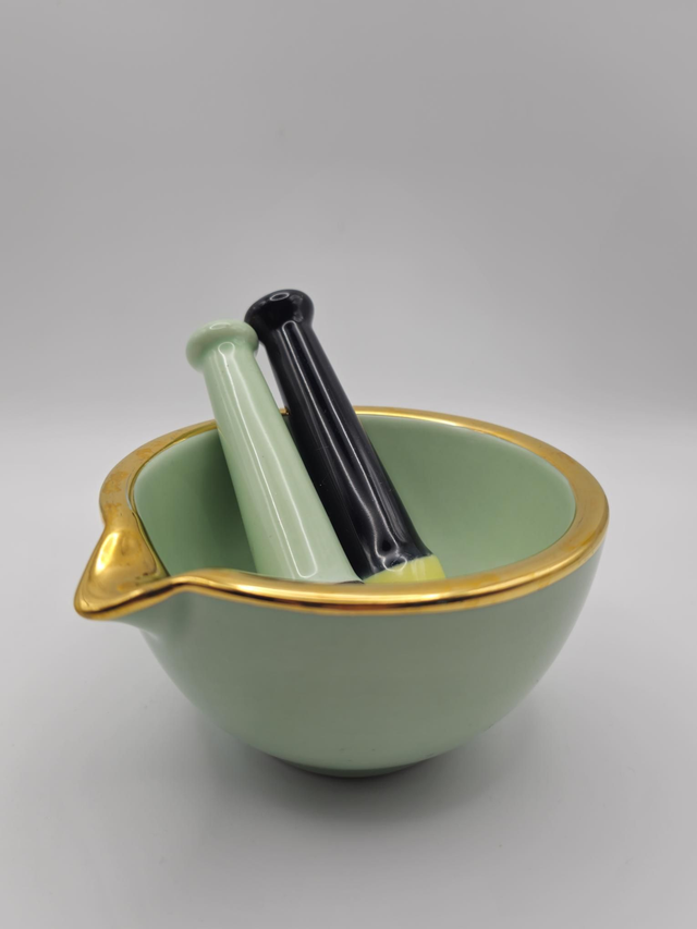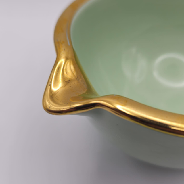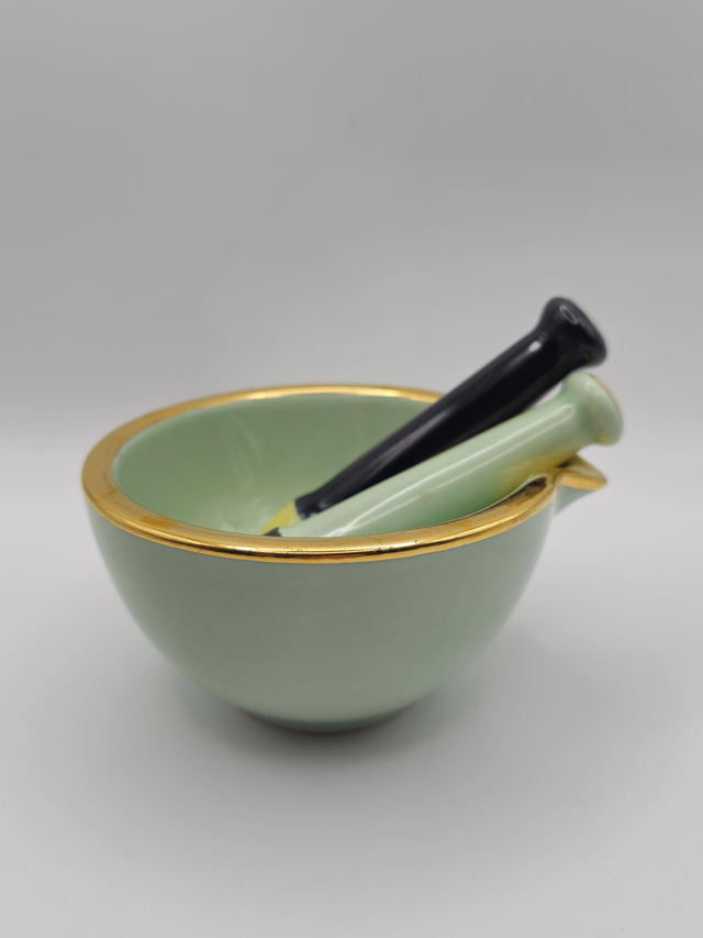Magnifique mortier Art Déco, en céramique émaillée vert pâle , rehaussé d'une sublime bordure en or.