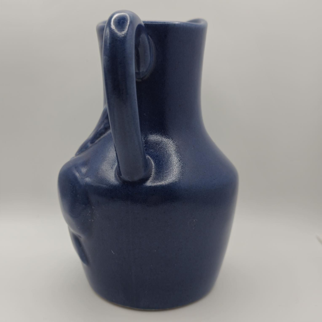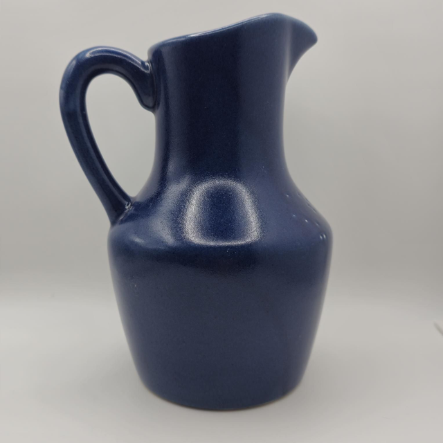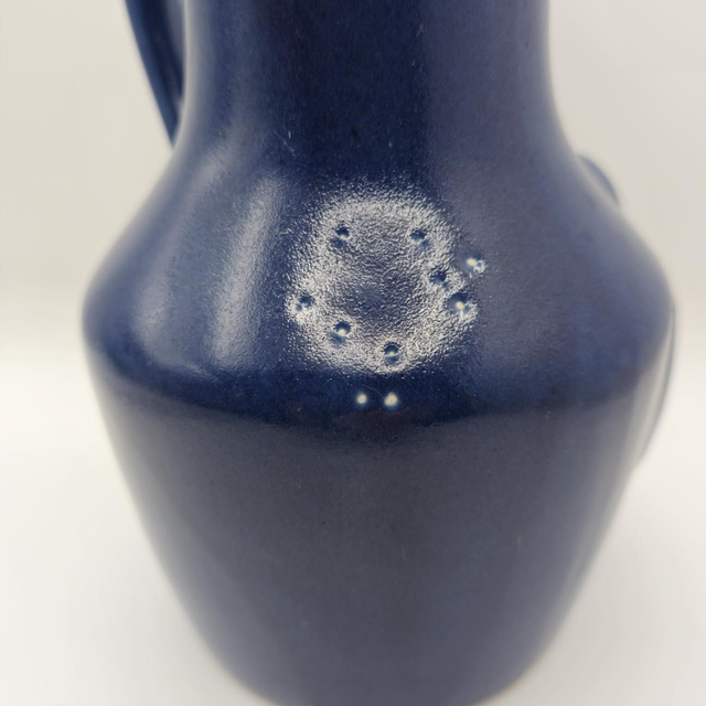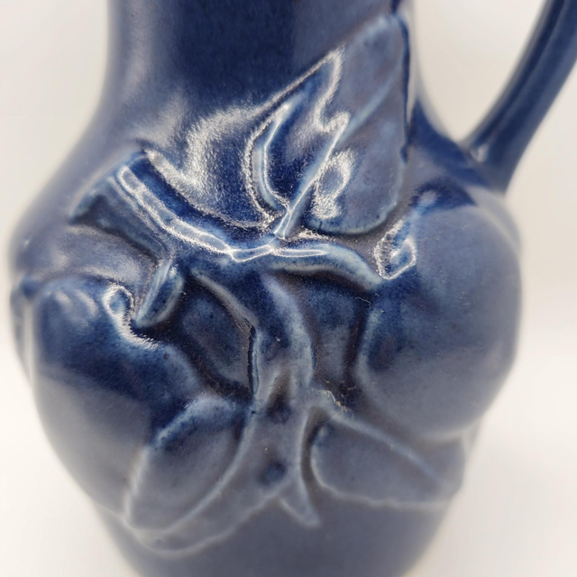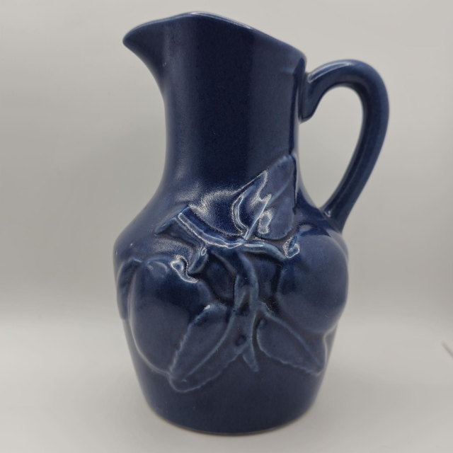 ​●Pichet de collection en céramique, arborant une glaçure bleu cobalt profond et un décor en relief de motifs de pommes .