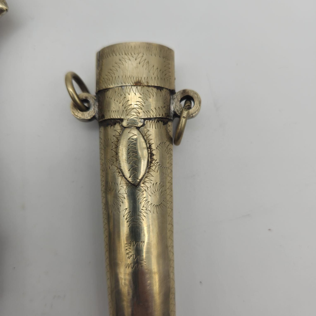 Le fourreau présente des anneaux de bélière et une fine inscription gravée.