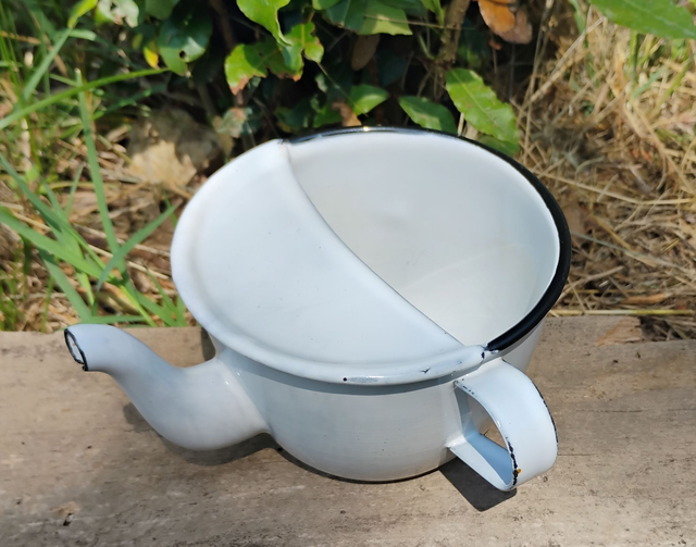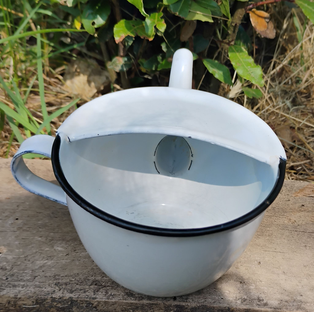 Atypique cette tasse 1900 à bec verseur, utilisé pour les enfants ou les malade , métal émaillé.