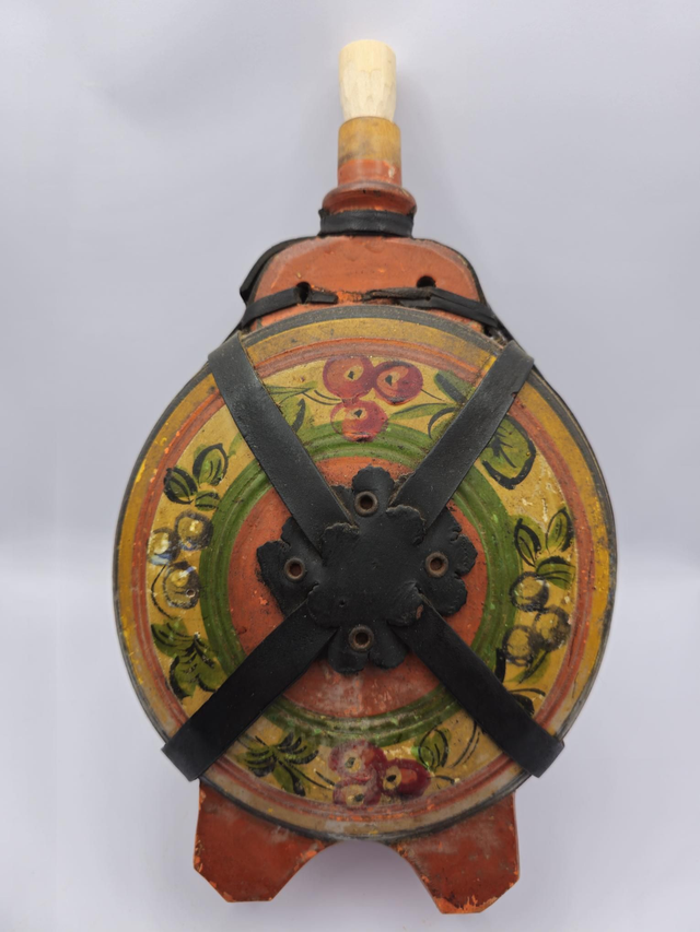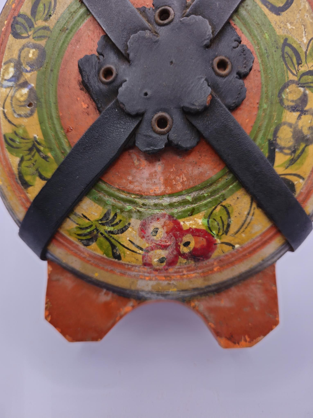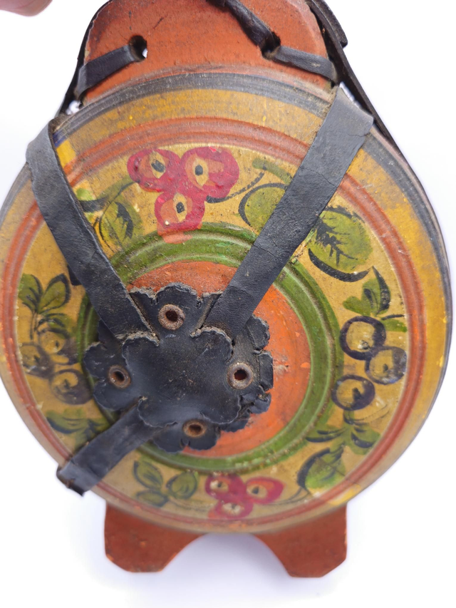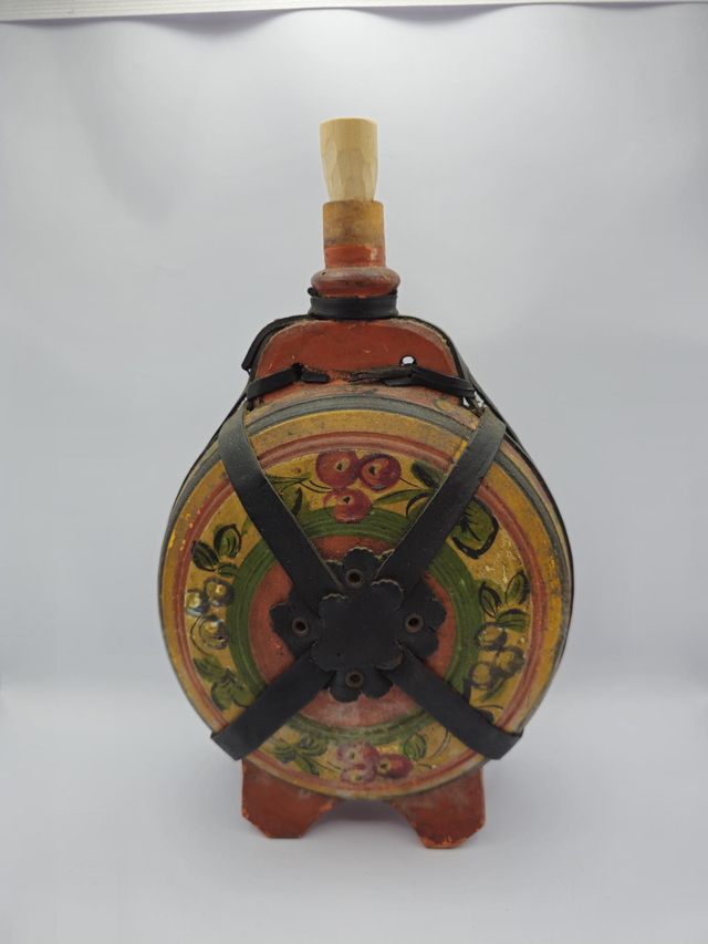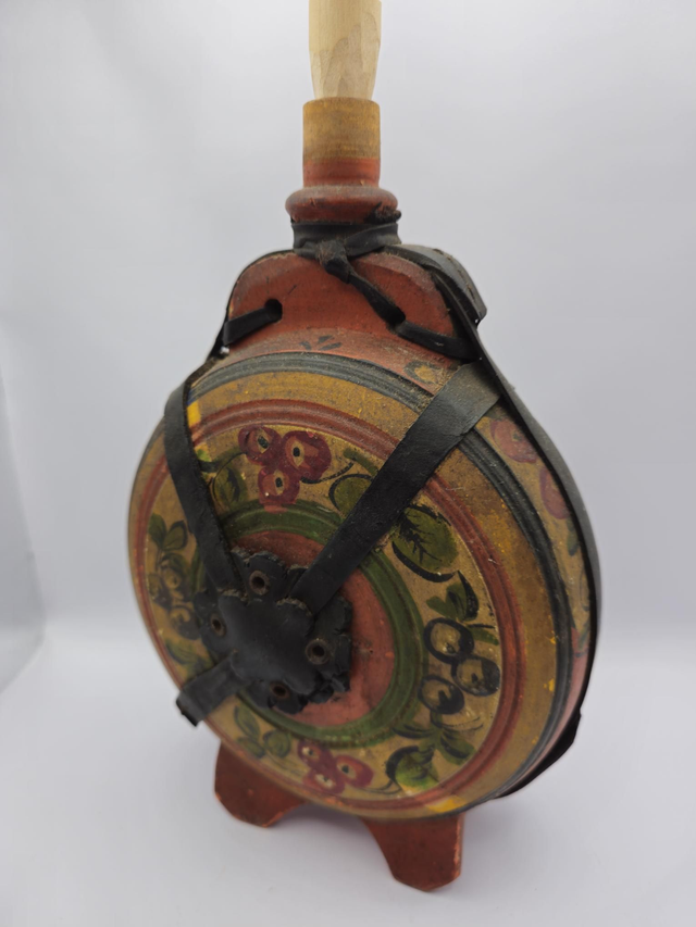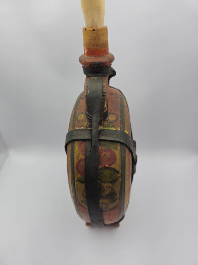 Ancienne gourde en bois peint ,décor Russe , elle a quelques égratignures et une sangle de cuir est cassée.