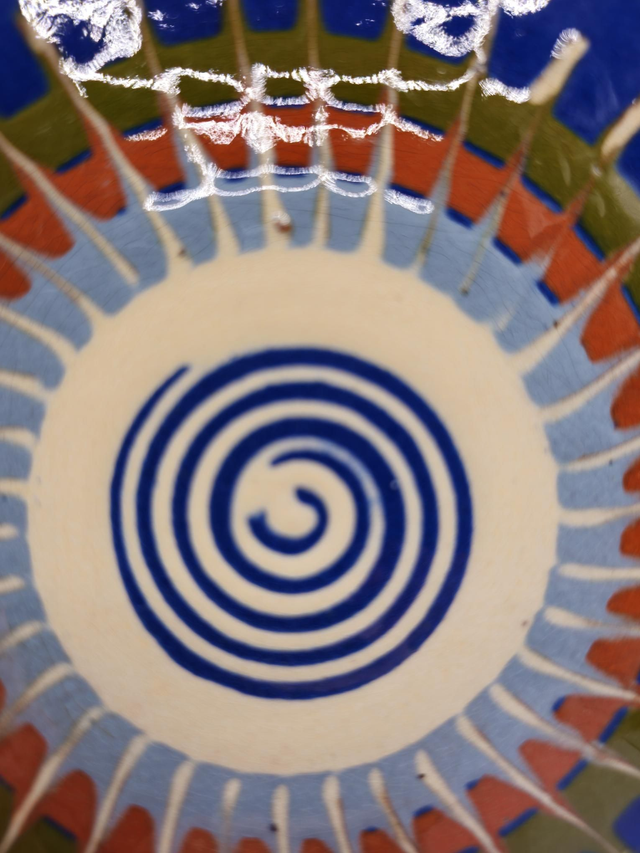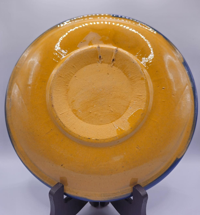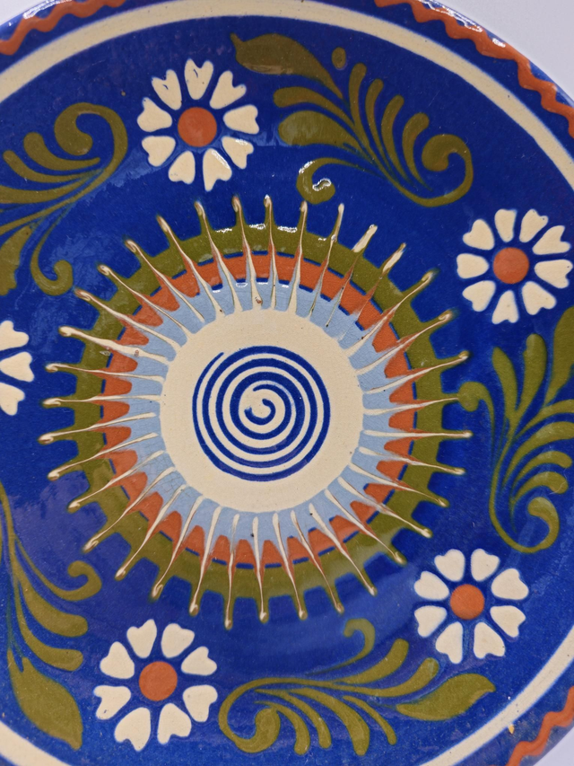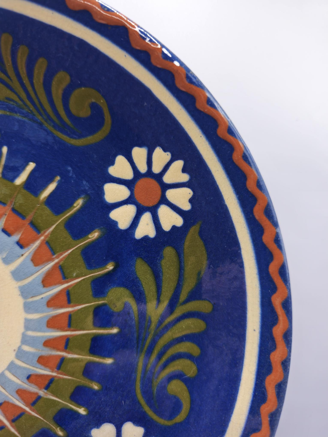 Sublimissime assiette en céramique, peinte à la main, typique de l'artisanat alsacien (style Soufflenheim). Un motif éclatant de soleil et de marguerites sur un fond bleu profond. Parfaite pour une déco murale authentique et colorée.