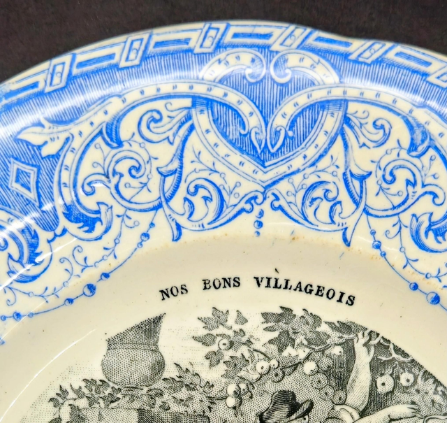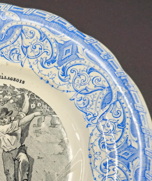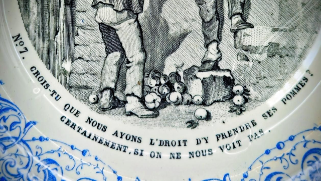 Superbe assiette parlante française du XIXe siècle (période Barluet, 1876-1884), de la manufacture renommée Creil et Montereau. Décor charmant en camaïeu bleu. Scène gravée humoristique de chapardage de pommes avec la légende iconique : "CROIS-TU QUE NOUS AYONS L'DROIT D'Y PRENDRE SES POMMES ? CERTAINEMENT, SI ON NE NOUS VOIT PAS."