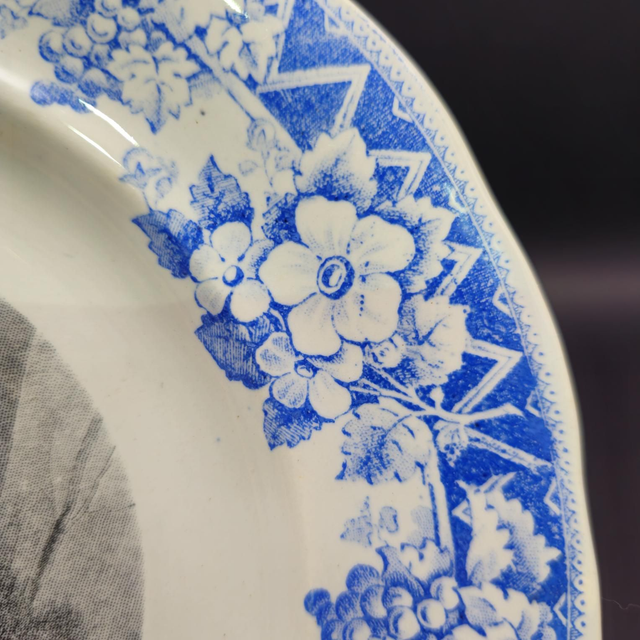 ●Superbe assiette décorative en faïence opaque à motif noir et blanc central, encadrée d'une magnifique bordure florale bleu cobalt.