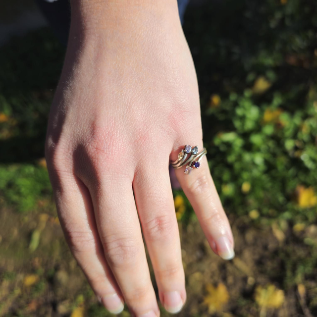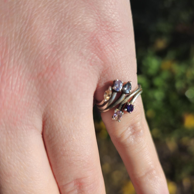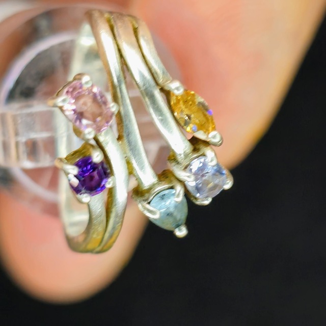Laissez-vous charmer par cette bague en argent (Sterling 925) au design torsadé et élégant. Elle est ornée de cinq pierres naturelles aux couleurs vives ( Améthyste, Citrine, Topaze, etc.), offrant un look sophistiqué et joyeux.