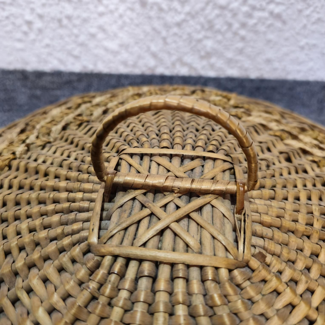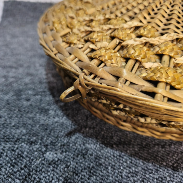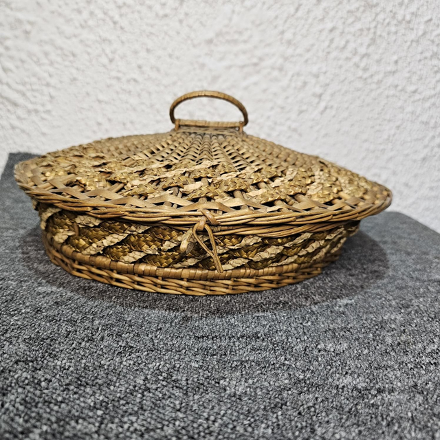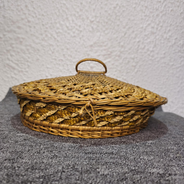 Panier/Boîte à Couvercle en vannerie tressée, pièce authentique au charme vintage seventies (style hippie chic ou folk).