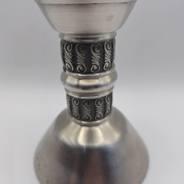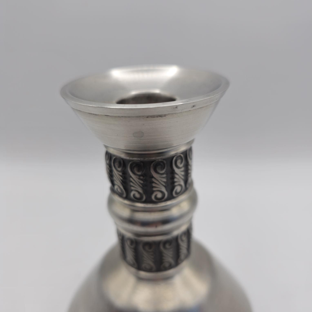 Magnifique bougeoir vintage en étain massif, authentique artisanat de Norvège. Son design allie une base évasée moderne et un fût orné de motifs traditionnels de volutes (inspiration viking), noircis pour un contraste élégant.