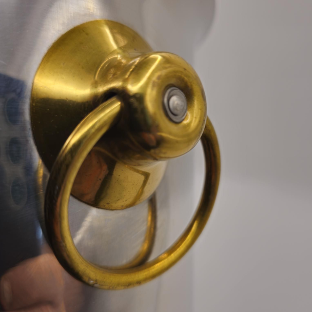 Détail de Luxe : Équipé de deux poignées anneaux en laiton doré, ajoutant une touche vintage et chic à votre table.
