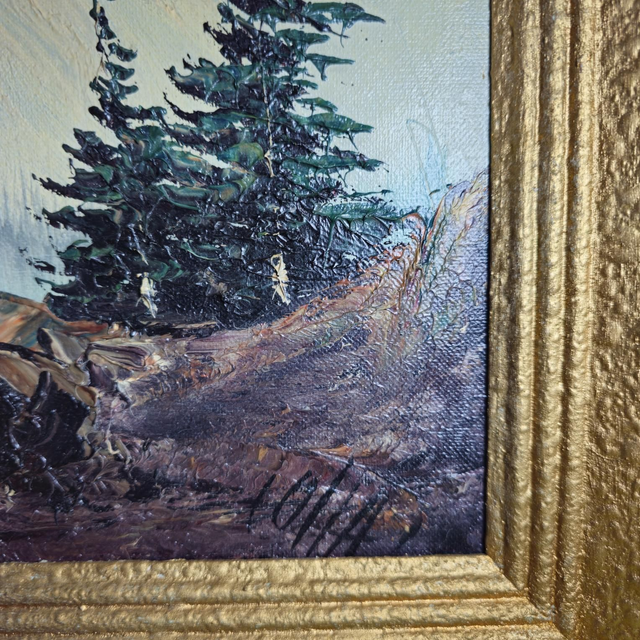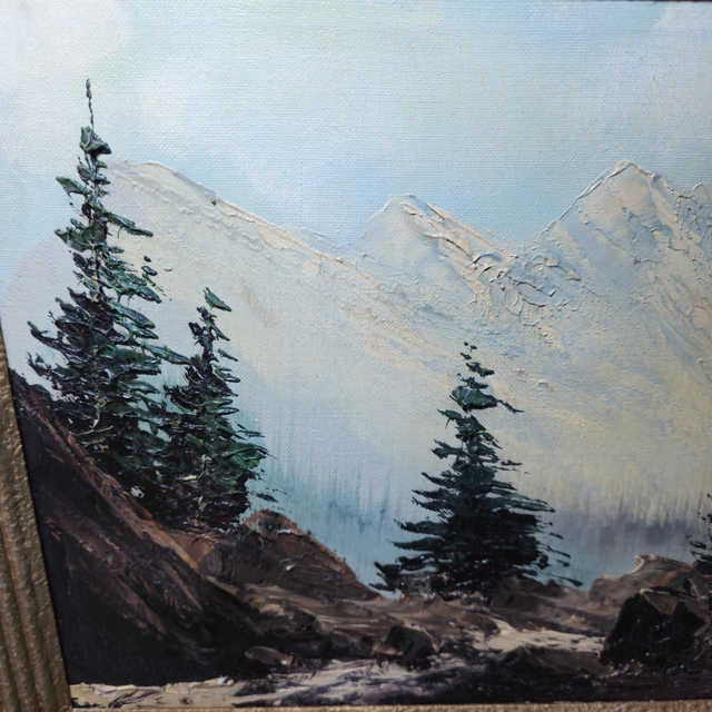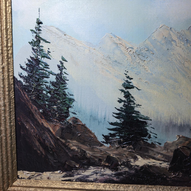 Sublimez votre intérieur avec ce tableau unique ! Réalisé avec une belle technique à l'empâtement, il représente un paysage de montagnes enneigées et de conifères, apportant une touche de sérénité et d'évasion à votre décoration.