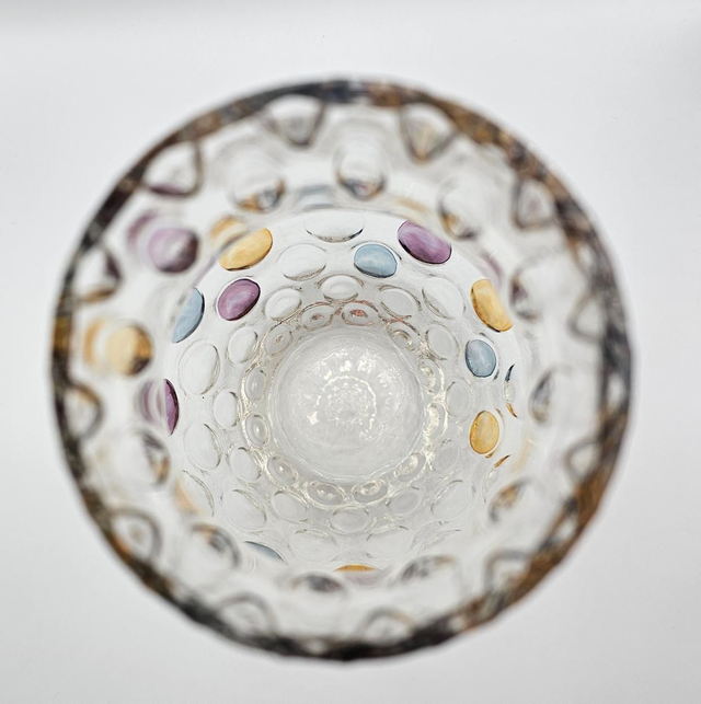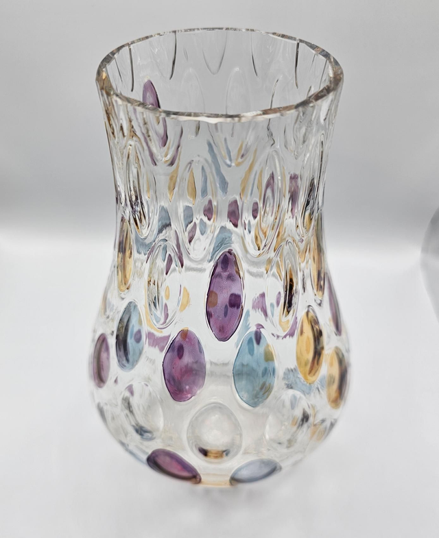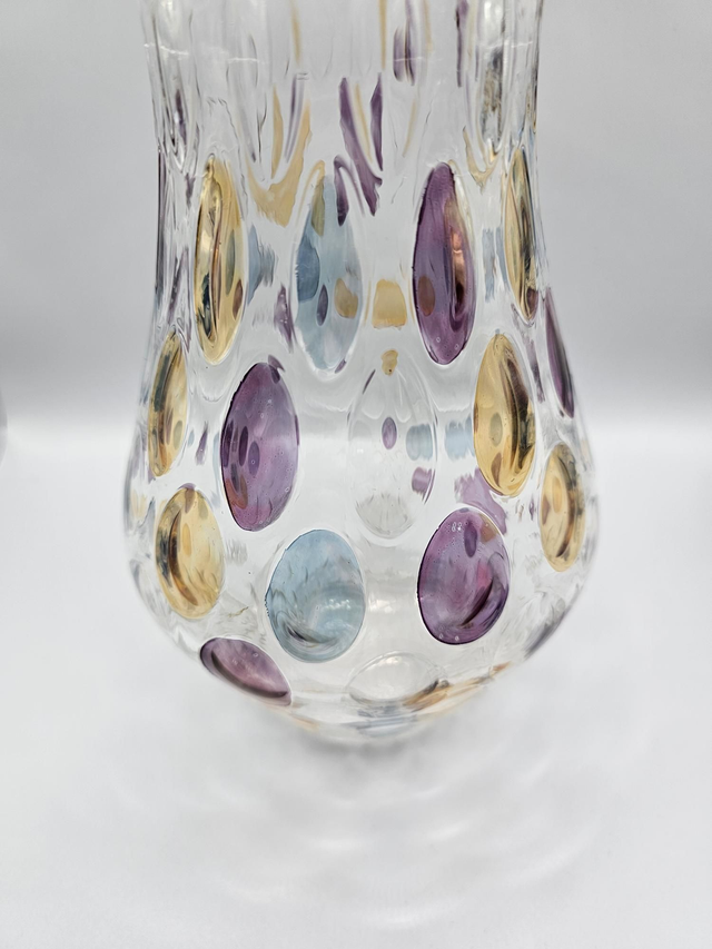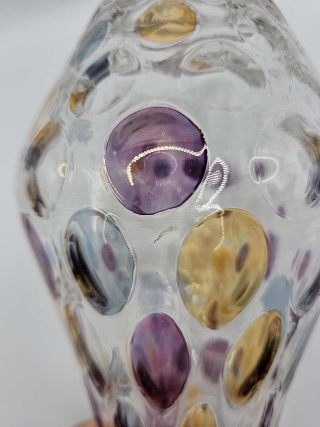 ​Ce vase présente la technique spectaculaire du Bullicante (bulles contrôlées) ornée d'inclusions de couleurs : violet, bleu et ambre doré.