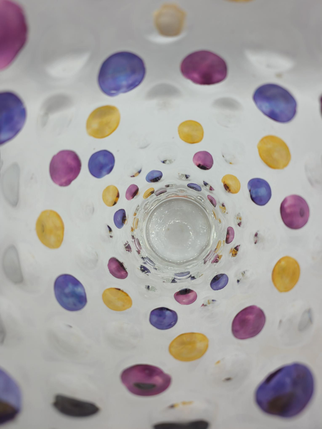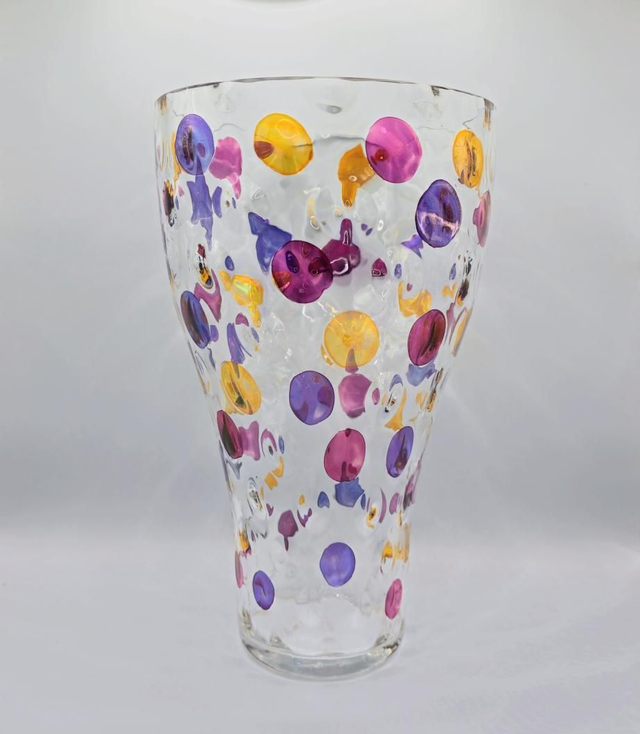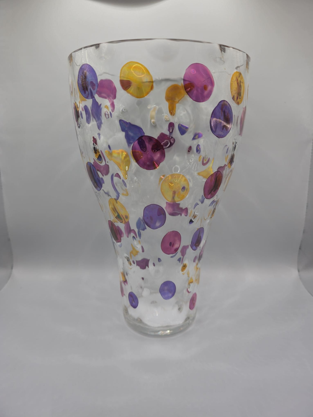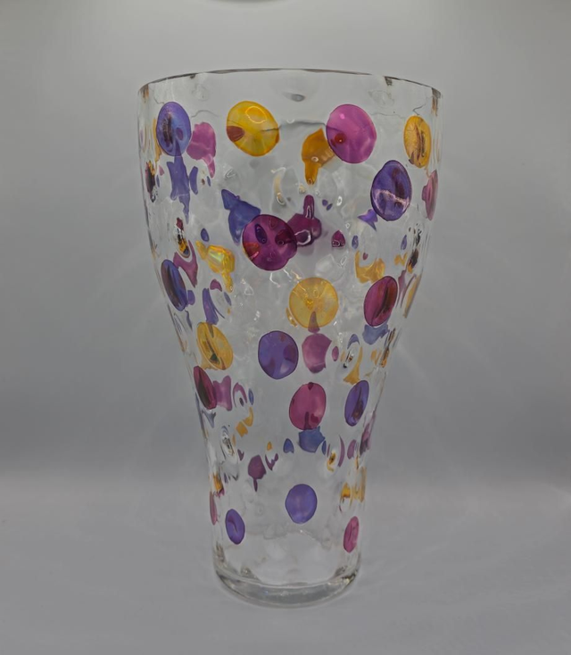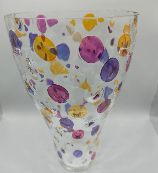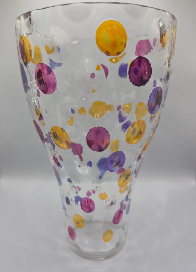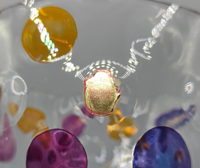Magnifique vase vintage Tchécoslovaquie (Verre de Bohême). Verre transparent texturé avec un décor gai et coloré de pois (magenta, jaune, violet). Idéal pour une touche de couleur et un style Mid-Century/Pop Art dans votre intérieur.