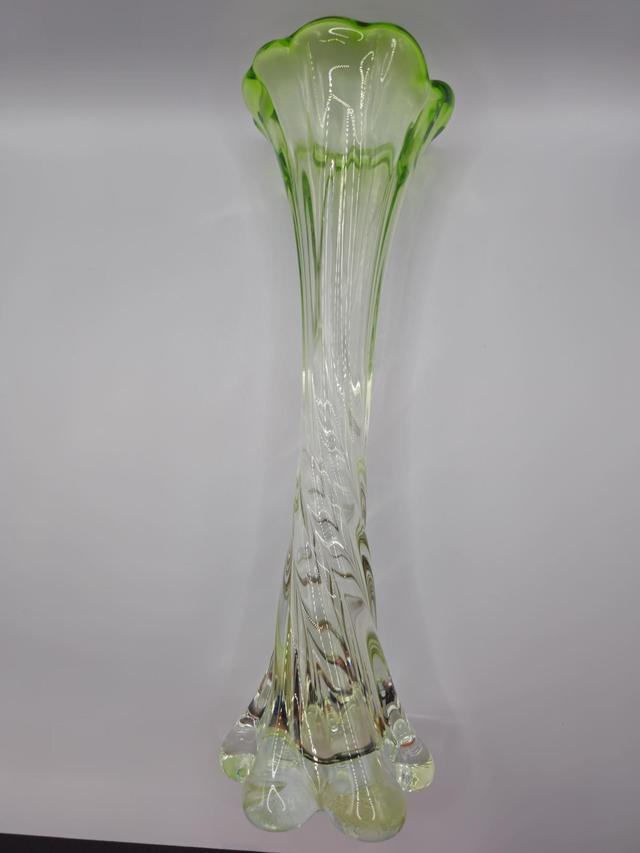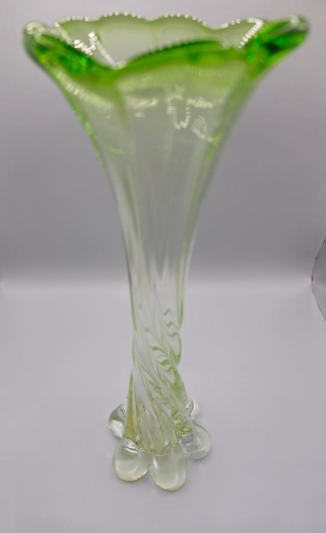 Magnifique vase décoratif, soufflé à la main, de style trompette avec un long col torsadé. Il présente une couleur vert clair opalescent et une bordure ondulée vert vif. Sa base est ornée de pieds bulbeux .